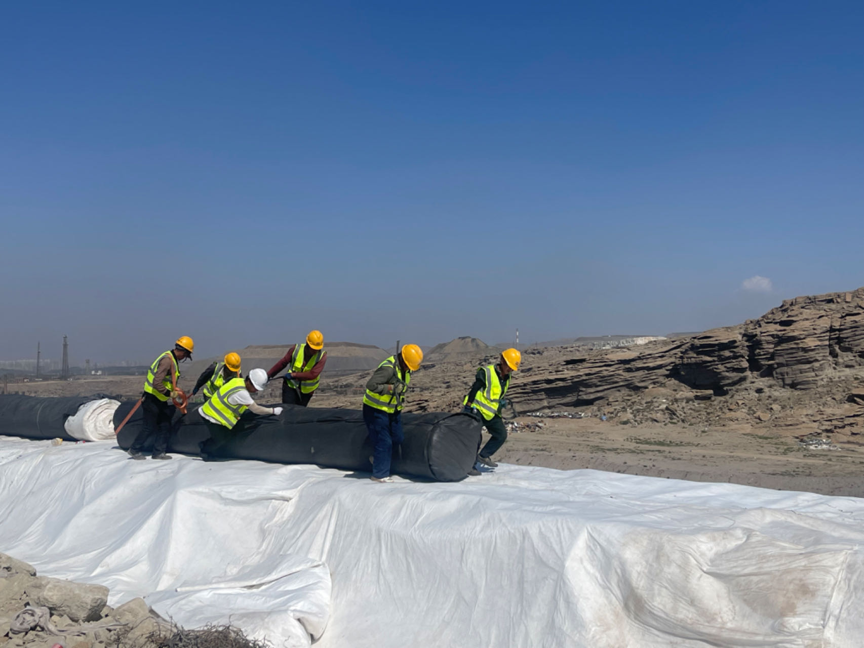 入秋以来,本就常年大风的乌海市海渤湾区,接连刮起五六级强风,气温骤然下降,但却丝毫不减施工现场的“火热”。一辆辆挖掘机、运输车在大风和黄沙间穿行,机械设备轰鸣运转,6名施工人员正拉拽一卷8米宽的防水卷材徐徐向前。“垃圾消纳场地表需要铺设这种特制防水膜,每卷重量达1.3吨,由于吊车不能驶入防水层,材料运抵后只能肩挑人扛入场。”乌海项目部安质环部负责人李宗宣说道。