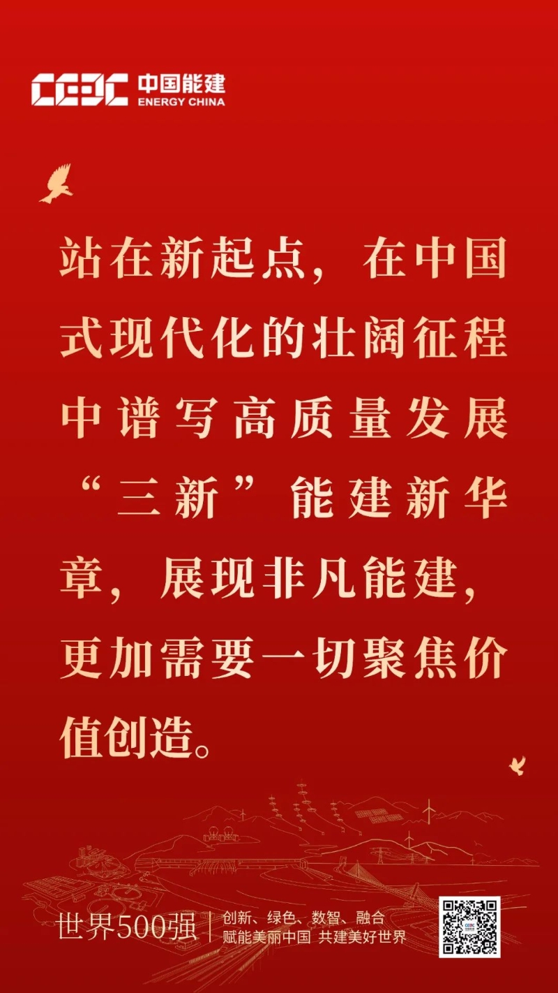 大风泱泱,大潮滂滂,一幅恢宏的画卷正在铺展,一曲激昂的战歌正在奏起,一次伟大的远征已经开始,一个崭新的“三新”能建正呼之欲出。让我们更加紧密地团结在以习近平同志为核心的党中央周围,在大势中定向,在大局中定位,在大考中定力,在全力为国家重点战略和能源安全提供坚强保障的征程中,不断开创建设高质量发展“三新”能建的崭新局面,为全面推进中国式现代化强国建设、民族复兴伟业作出新的更大贡献。