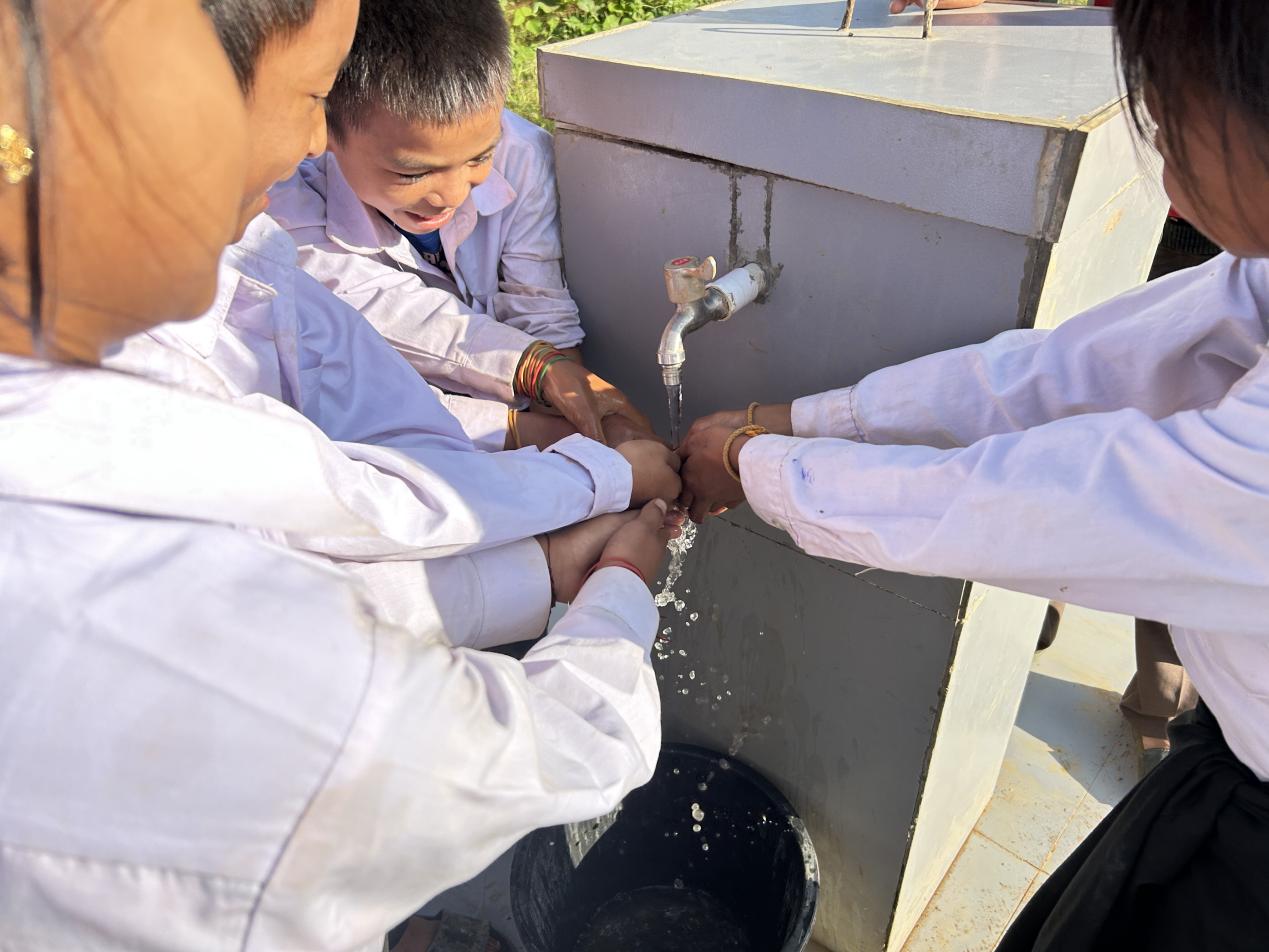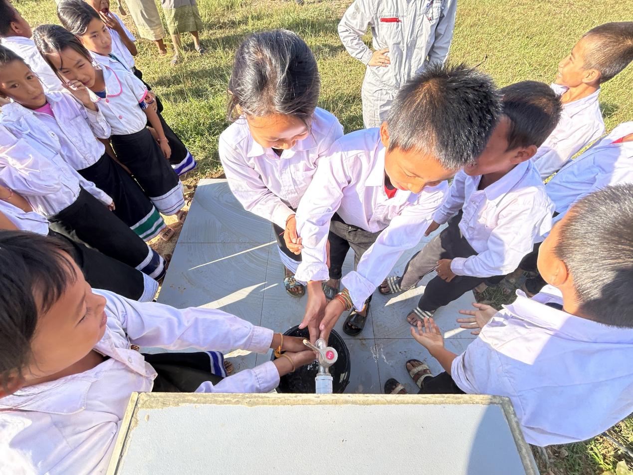 在老挝北部群山环绕的乔家罗村,一场简朴而热烈的“出水仪式”在乔家罗村小学操场东北角举行。当清澈的地下水从井口喷涌而出时,围观的孩子们欢呼雀跃、捧水洗手,老师们双手合十、连声道谢,现场的掌声与笑声久久回响。